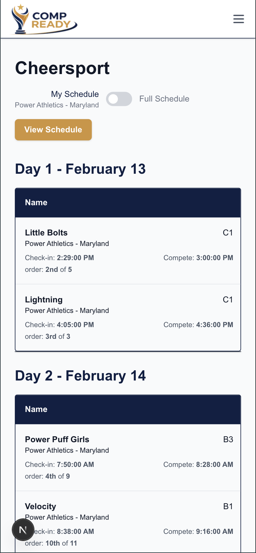 We're currently gathering feedback from early adopters in the cheerleading community. Test the web platform, help us identify bugs, and shape the product with your insights. Your input is crucial in making Comp Ready the best tool for competition scheduling.